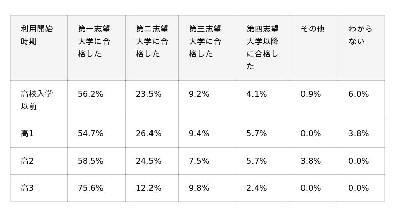 「第一志望大学に合格した」と回答した割合が最も高かったのは、「高校3年生」から利用を開始した層で、75.6%に達しました。