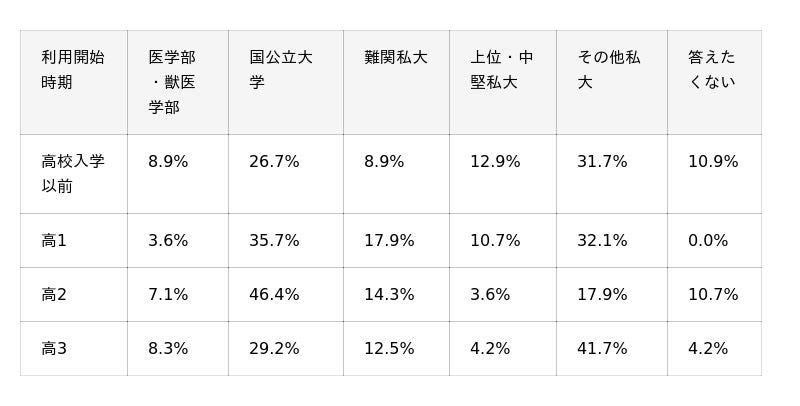 - 調査概要:大学入試に向けた教育サービスの利用開始時期と大学合格の調査