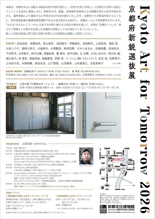 京都で新しい芸術の創造に取り組む新進の若手作家を紹介する展覧会「Kyoto Art for Tomorrow 2026 -京都府新鋭選抜展-」を1月10日(土)から京都文化博物館で開催します。