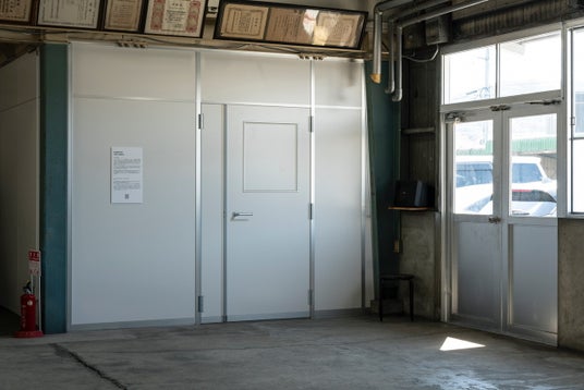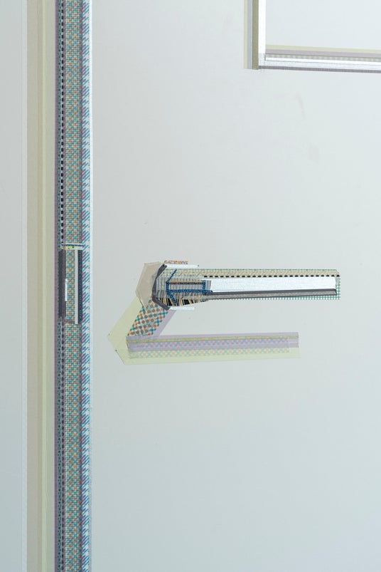 小宮太郎 <<少しだけ開いた扉>> 2024 マスキングテープ カモ井加工紙の食堂の壁 Photo by Yuki MORIYA
