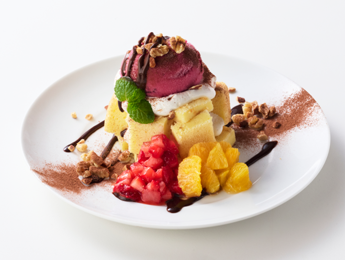 冬フェスタは、しっとりとした食感の元町シフォンに甘酸っぱいいちごとオレンジを盛りつけて、食感のアクセントにミックスナッツを散らした大人な味わいに仕上げました。