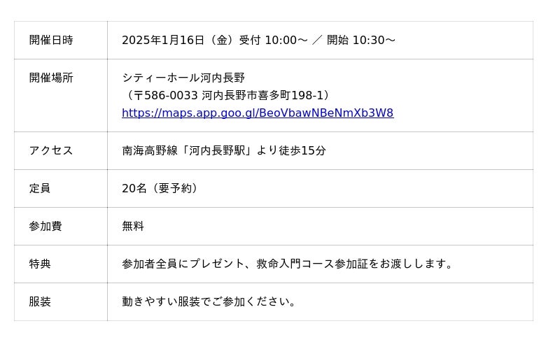 株式会社ベルコ堺支社・河内長野支部代理店(所在地:大阪府河内長野市)は、地域住民を対象とした『命を守る講習会(救命入門コース)』を 2025年1月16日(金) に開催いたします。参加費は無料で、事前予約制・定員20名となります。