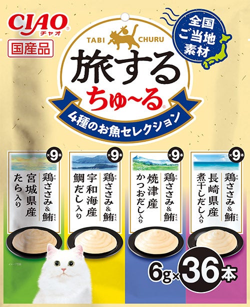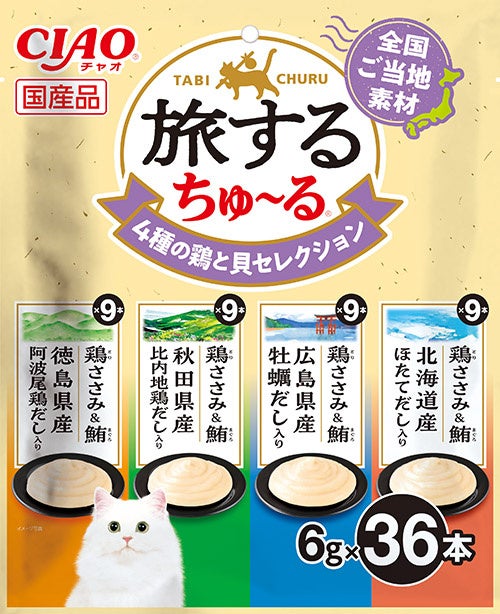 いなばペットフード株式会社(いなば食品グループ 本社:静岡県静岡市清水区由比)は、全国ご当地素材を使用している猫ちゃん用「CIAO 旅するちゅ~る」の36本入りバラエティパックを新発売いたしました。1パックで4種類の味を楽しめますので、愛猫との旅行気分をたっぷりご堪能いただけます。