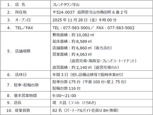 株式会社平和堂(滋賀県彦根市、代表取締役社長執行役員CEO:平松正嗣、以下「平和堂」)は、2025年11月28日(金)あさ9時、滋賀県守山市にフレンドタウン守山(以下「当店」)をオープンしますので、お知らせします。当店のオープンにより、滋賀県内は84店舗、平和堂は全169店舗となります。