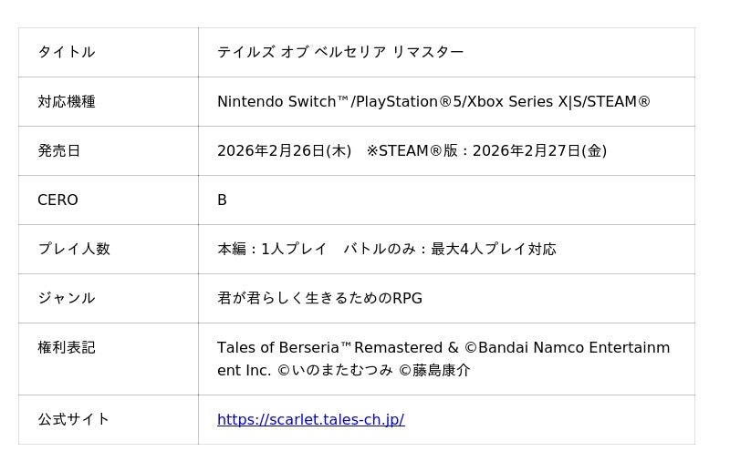 株式会社バンダイナムコエンターテインメントは、「テイルズ オブ ベルセリア リマスター」をNintendo Switch(TM)/PlayStation(R)5/Xbox Series X|S/STEAM(R)にて、2026年2月26日に発売することをお知らせいたします。