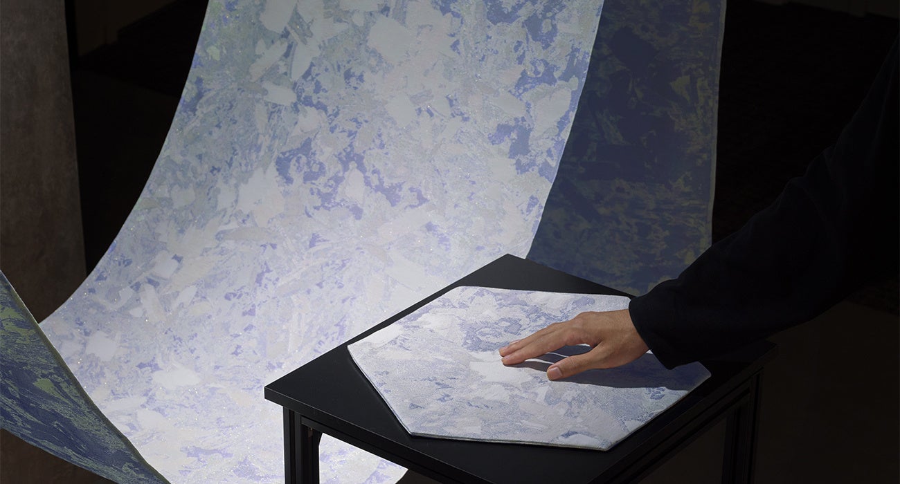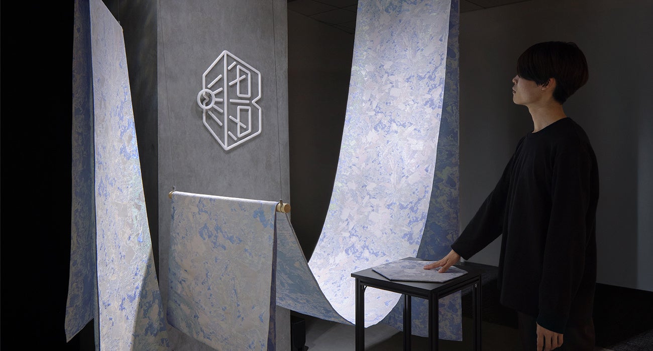 西陣織の老舗「HOSOO」の協力のもと、光の当たる角度で多彩な表情を見せる”特別なテキスタイル”を使用しています。センサーが手の動きを感知し、来場者が布に触れることで、布に当たる光が変化し幻想的な空間を創り出します。