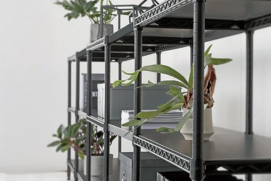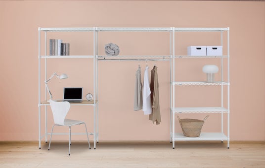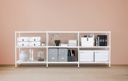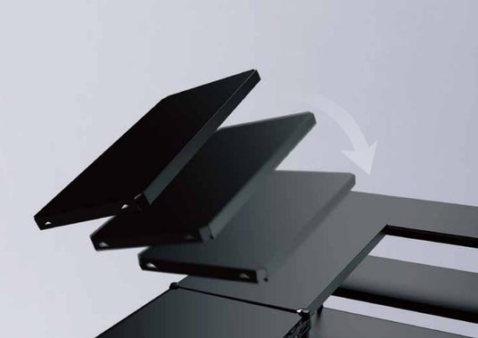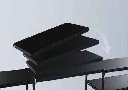 フレーム外側の線材に天板をはめ込むだけで、自由に拡張できます。ワイドな壁面収納からL字のコーナー、パーティション利用まで、自在に構成できます。