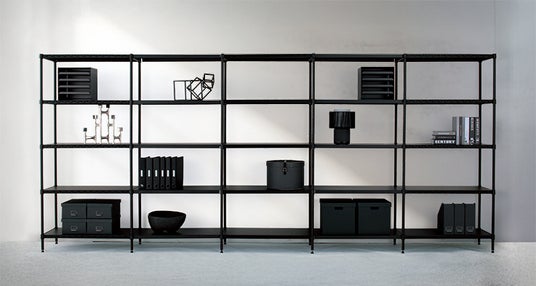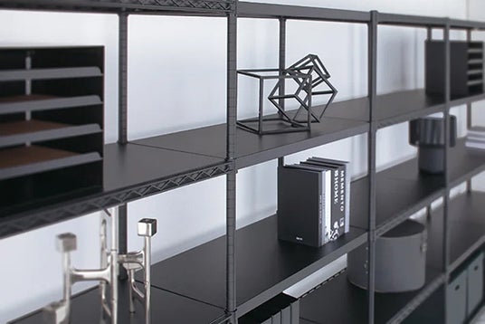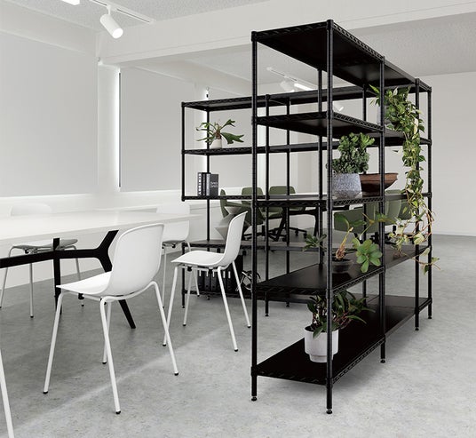 シェルフは、フレームにスチール天板を落とし込んだ二重構造。水平ラインが際立ち、オフィスや店舗、住空間まで幅広い環境に調和します。