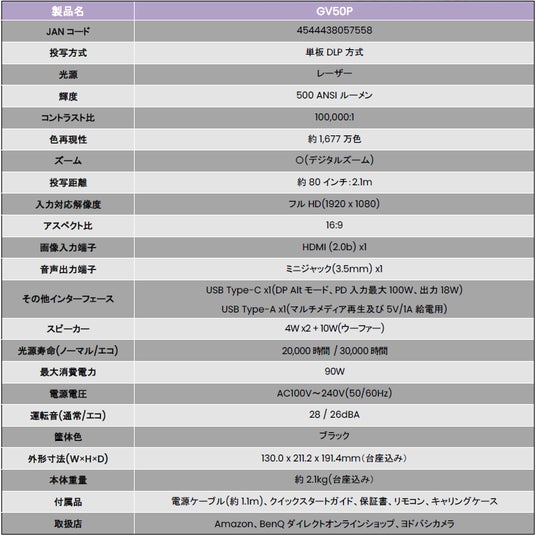 GV50:https://www.benq.com/ja-jp/projector/portable/gv50p.html