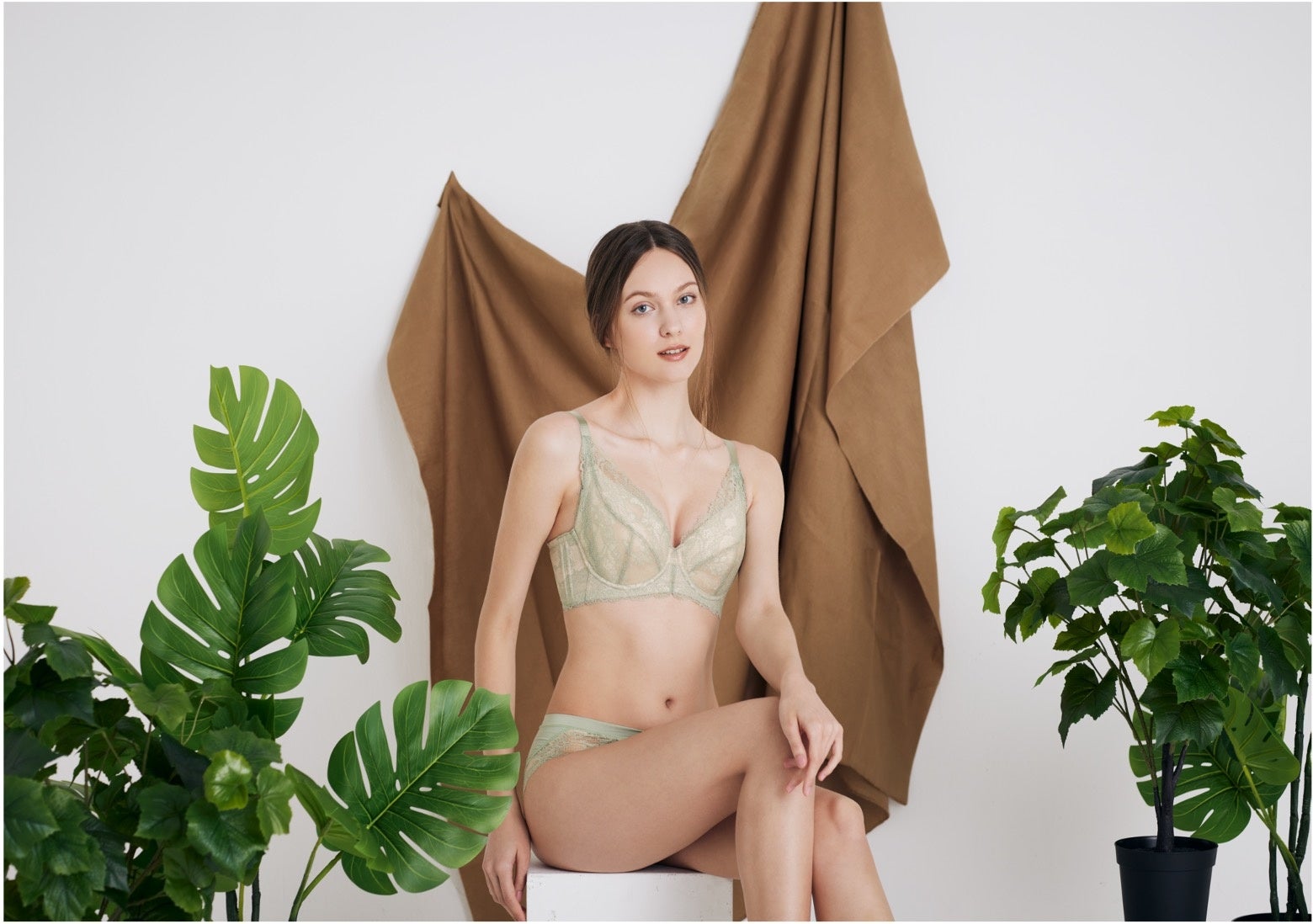 カップのベースは淡いゴールド、その上にニュアンスのあるグリーンレースを重ねることで、落ち着きの中に柔らかな華やぎが。肌映りがよく、冬の装いにもぴったりです。日常にも特別な日にも寄り添う、気品あるカラーバランスです。