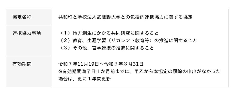学校法人武蔵野大学(東京都江東区、理事長:横山 尚佳)は北海道共和町(町長:成田 慎一氏)と地方創生に関する連携協定を締結します。締結に伴い、令和7年11月19日に武蔵野大学有明キャンパスで調印式を執り行いました。