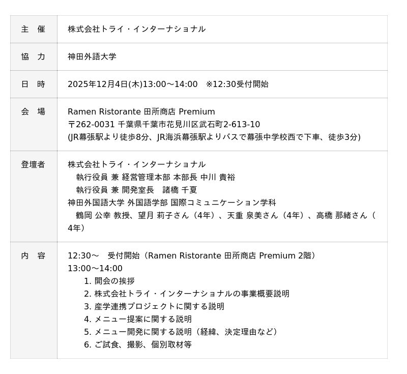 神田外語大学(千葉市美浜区/学長:宮内孝久)外国語学部 国際コミュニケーション学科の鶴岡公幸教授ゼミの学生たちが、「麺場 田所商店」を展開する株式会社トライ・インターナショナル(千葉県千葉市/代表取締役社長:田所史之)との官学連携プロジェクトとして、ハラルフレンドリー対応(※1)のらーめん2種類(味噌味、醤油味)を共同開発しました。本取り組みは、ハラル食を通じた“食の多様性”と“発酵文化の国際化”をテーマに、学生と企業が共同して日本の発酵文化を世界に発信していく新しい取り組みです。12月4日(木)には、(株)トライ・インターナショナルと神田外語大学によるメディア向け発表会&試食会を開催いたします。