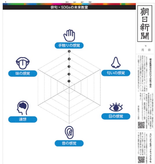 特別紙面は、「朝日新聞」の題字をあしらい、味や手触り、匂い、目、音の感覚と連想の六項目で構成された六角形のグラフや、朝日新聞に掲載されたSDGs関連の記事を掲載したものです。