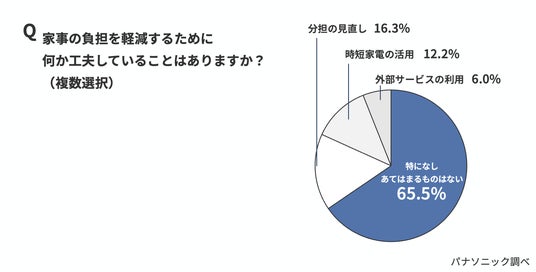 パナソニック株式会社は、11月22日の「いい夫婦の日」にあわせて、現代の夫婦・家族が抱える“家事ストレス”の実態調査を実施しました。家庭で日常的に繰り返される家事の中でも”食後の後片付け”を「面倒だ」と感じる人は全体の6割以上にのぼり、その背景には「他の予定と両立しづらい」「体力的・精神的に負担を感じる」といった声が多く見られます。また、家事分担について家族や同居人と定期的に話し合っている家庭は3組に1組程度であり、さらに「家事負担を軽減するための工夫をしていない」と回答した人が約7割に達しました。こうした状況から、負担を感じながらも話し合いや工夫が後回しになり、ストレスが蓄積しているという実態が浮かび上がっています。