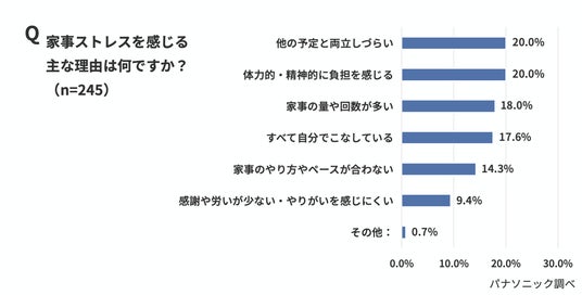 日常的に家事をしている人への「家事ストレスの主な理由」に関する質問では、20%が「他の予定と両立しづらい」「体力的・精神的に負担を感じる」と回答。