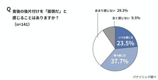「食後の後片付け」をどう感じるか聞いたところ、実に6割以上が食後の片付けに“面倒感”を覚えている一方、「全く感じない」というポジティブな声は合計9.5%のみ。