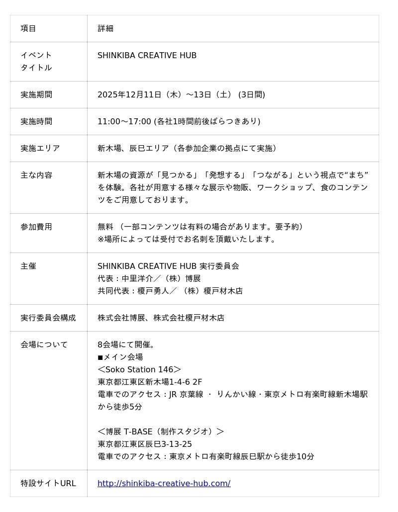 SHINKIBA CREATIVE HUB実行委員会(事務局:株式会社博展)は、新木場および辰巳エリアの工場や会社を開放し、まちの新たな可能性を探るイベント「SHINKIBA CREATIVE HUB」を、2025年12月11日(木)から13日(土)までの3日間にわたり開催いたします。今年が第1回目の開催となります。