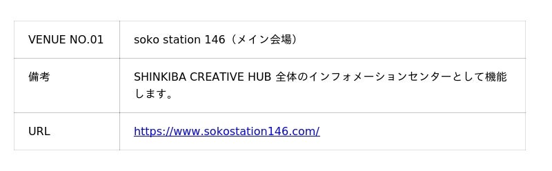 今回のイベントには、以下の会場パートナーが参加を予定しています。メイン会場のひとつであるSoko Station 146(VENUE NO.01)を中心に、直径約1km前後に会場が点在しております。