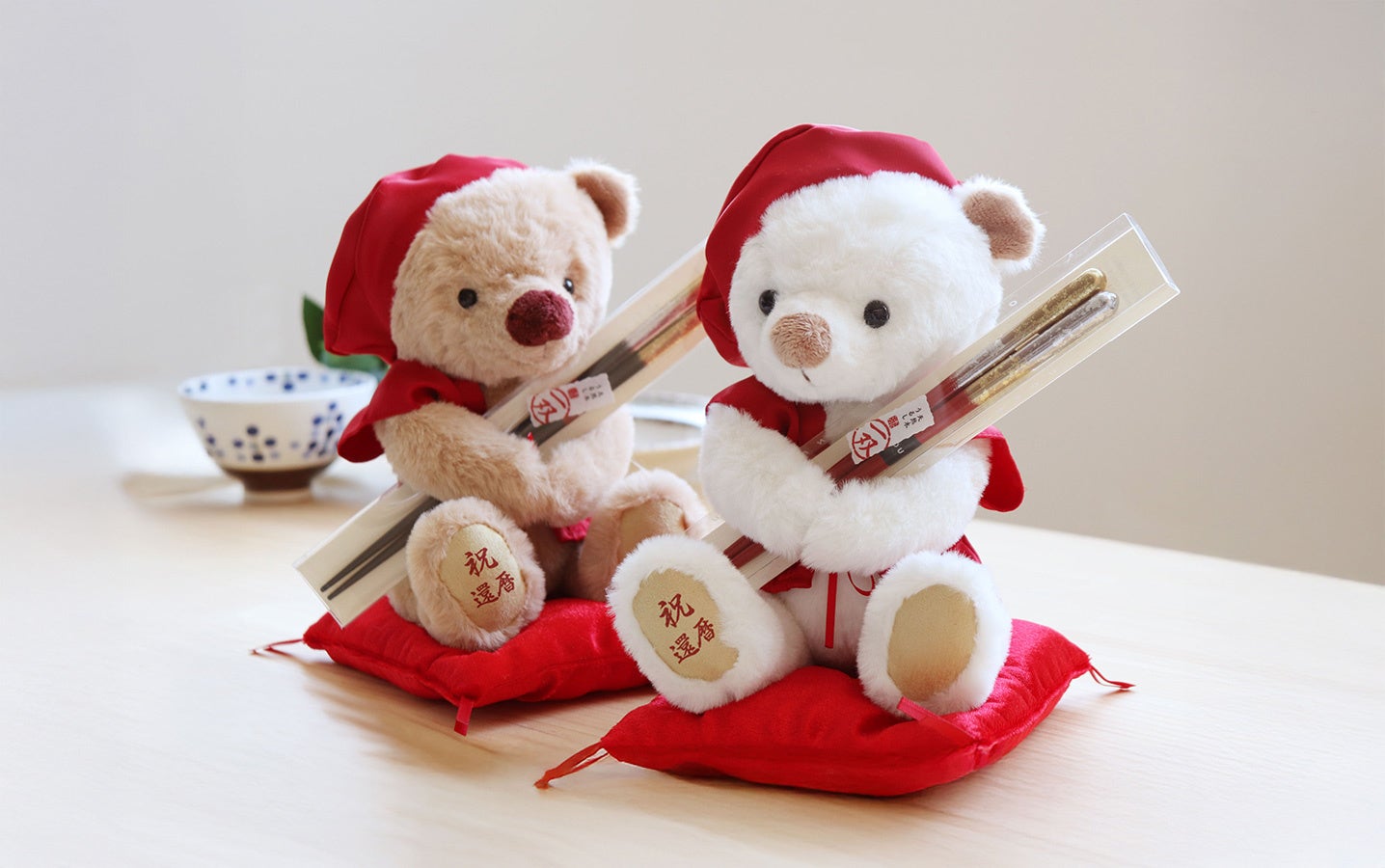 そこでプティルウでは、祝い箸に やわらかな温度を添える存在 として、オリジナルテディベアをセットにしました。