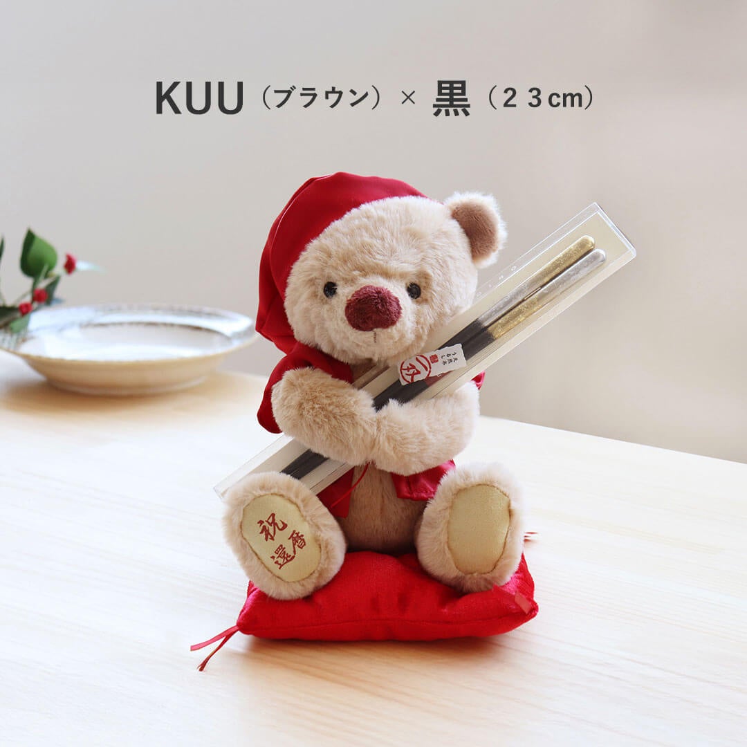 内容:還暦テディベアKUU(ブラウン)/一双 祝い箸「粋柄・祝彩」黒(23cm)/熨斗付き専用BOX