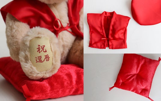 華やかさと格式があり、還暦の赤いちゃんちゃんこベアとの調和も美しく、フォトジェニックなギフトに仕上がりました。