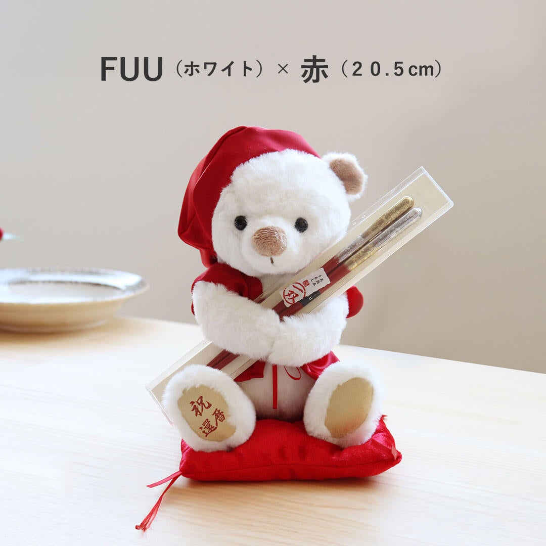 還暦テディベアFUU(ホワイト)/一双 祝い箸「粋柄・祝彩」赤(20.5cm)/熨斗付き専用BOX