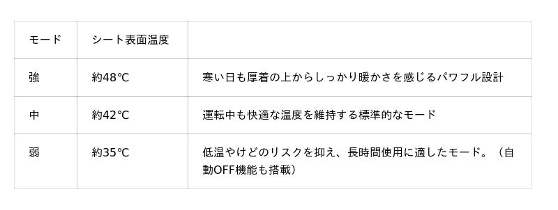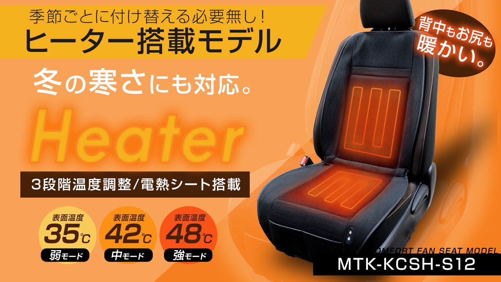 MTK-KCSH-S12モデル最大の魅力は、3段階の温度調整付きヒーターがもたらす即効性の高い暖かさです。シート内部の背中と座面の両方に電熱ヒーターを内蔵しており、スイッチONで瞬時に温熱を開始します。暖房が効き始めるまでの冷え込む時間も、このシートがあれば「すぐポカポカ」の快適空間に。
