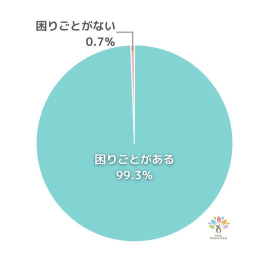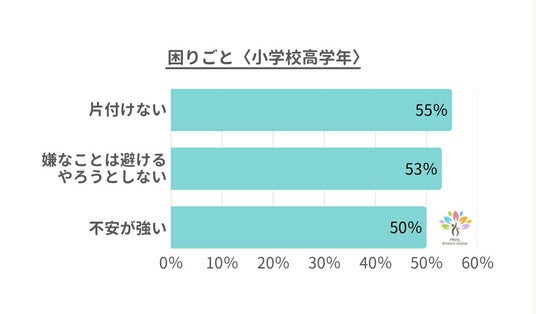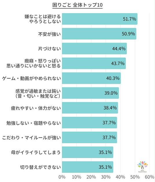 今回のアンケートでは、99.3%のお母さんが「子どもに関する何らかの困りごとがある」と回答しました。特に多かったのは、「嫌なことは避ける・やろうとしないこと」、「不安が強い」、「怒りっぽい」といった内容です。