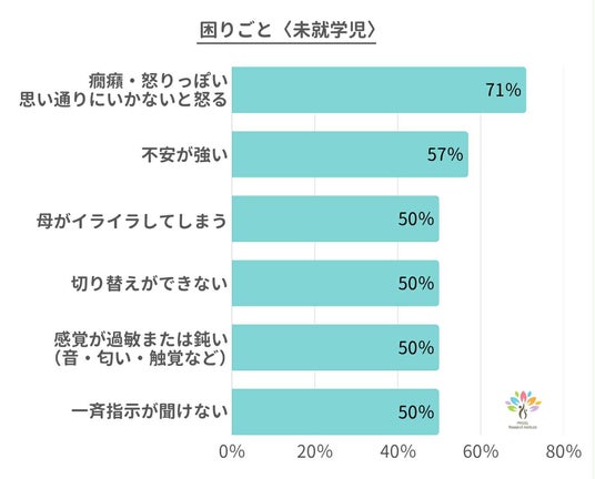 「癇癪」「怒りっぽさ」「やろうとしない」といった行動の背景には、不安や自信のなさがある可能性もあります。 また「母がイライラしてしまう」という回答も見られ、子どもの困りごとが母親のメンタルに影響を与えていることが考えられます。