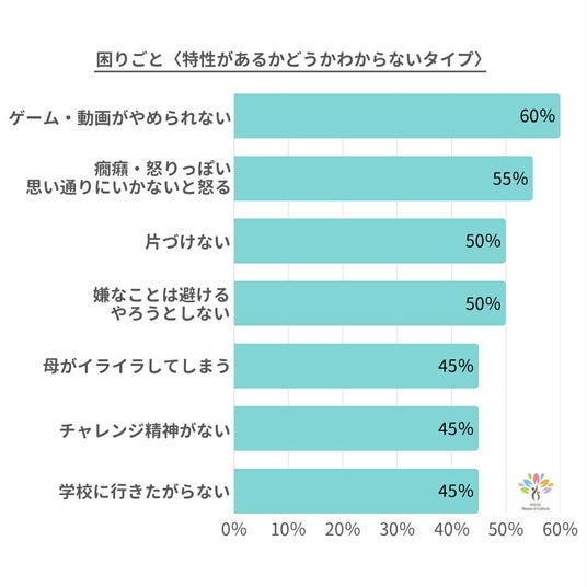 5位「母がイライラしてしまう」「チャレンジ精神がない」「学校に行きたがらない」45%でした。