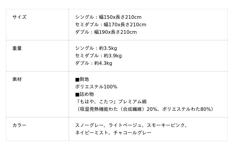 より暖かさを感じられるよう、吸湿発熱機能わたの配合率を従来の10%から20%に増やしました。さらに中綿全体の充填量も各サイズ200~300g追加し、より贅沢でボリューム感のある仕上がりにしました。