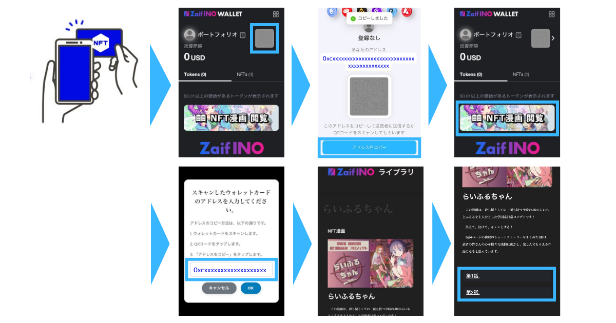 『らいふるちゃん』NFT購入時に受け取った NFTカードをスマートフォンでスキャンし、Zaif INOウォレットへアクセス