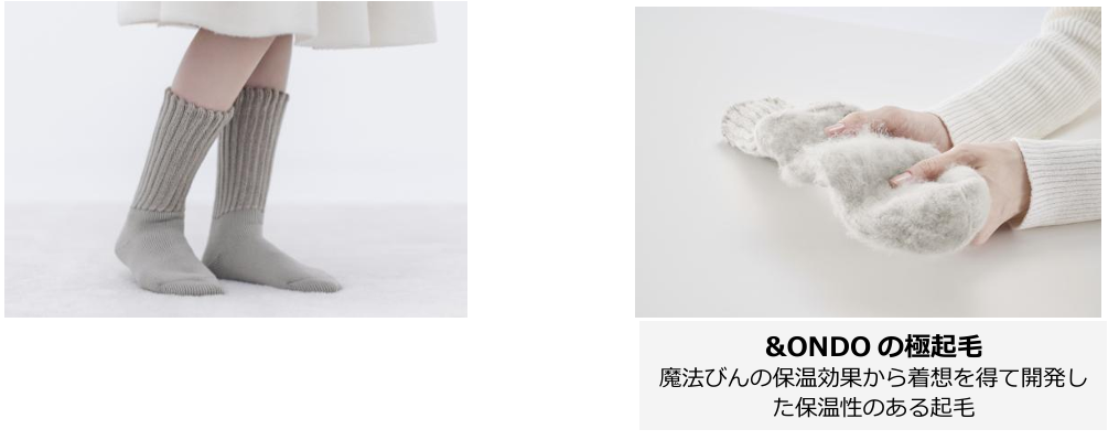 サーモスが展開するアパレル小物ブランド「&ONDO」のメインアイテム「起毛であったかルームソックス」は、独自開発した毛足の長い極起毛が特長で、魔法びんのような保温効果を実現します。
