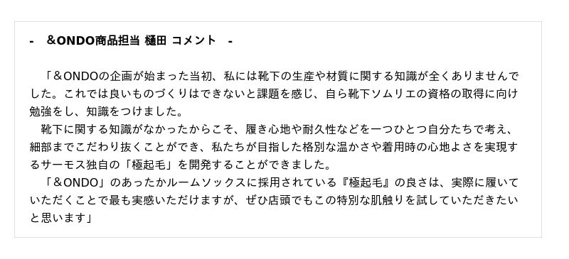 魔法びんのグローバル企業として、人と社会に快適で環境にもやさしいライフスタイルを提案するサーモス株式会社(本社:東京都港区 社長:片岡 有二)は、2024年からルームソックスをはじめとするアパレル小物のサブブランド「&ONDO(アンドオンド)」を展開しています。