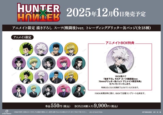 ※12月6日(土)より予約開始予定のECサイト「AMNIBUS」では、BOX購入特典として「ヒソカ ちびキャラ スーツver. 75mmグリッター缶バッジ AMNIBUS限定特典」を予定しております。