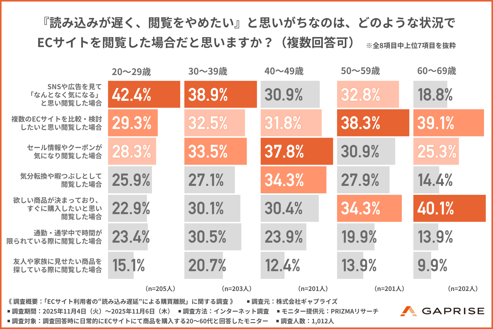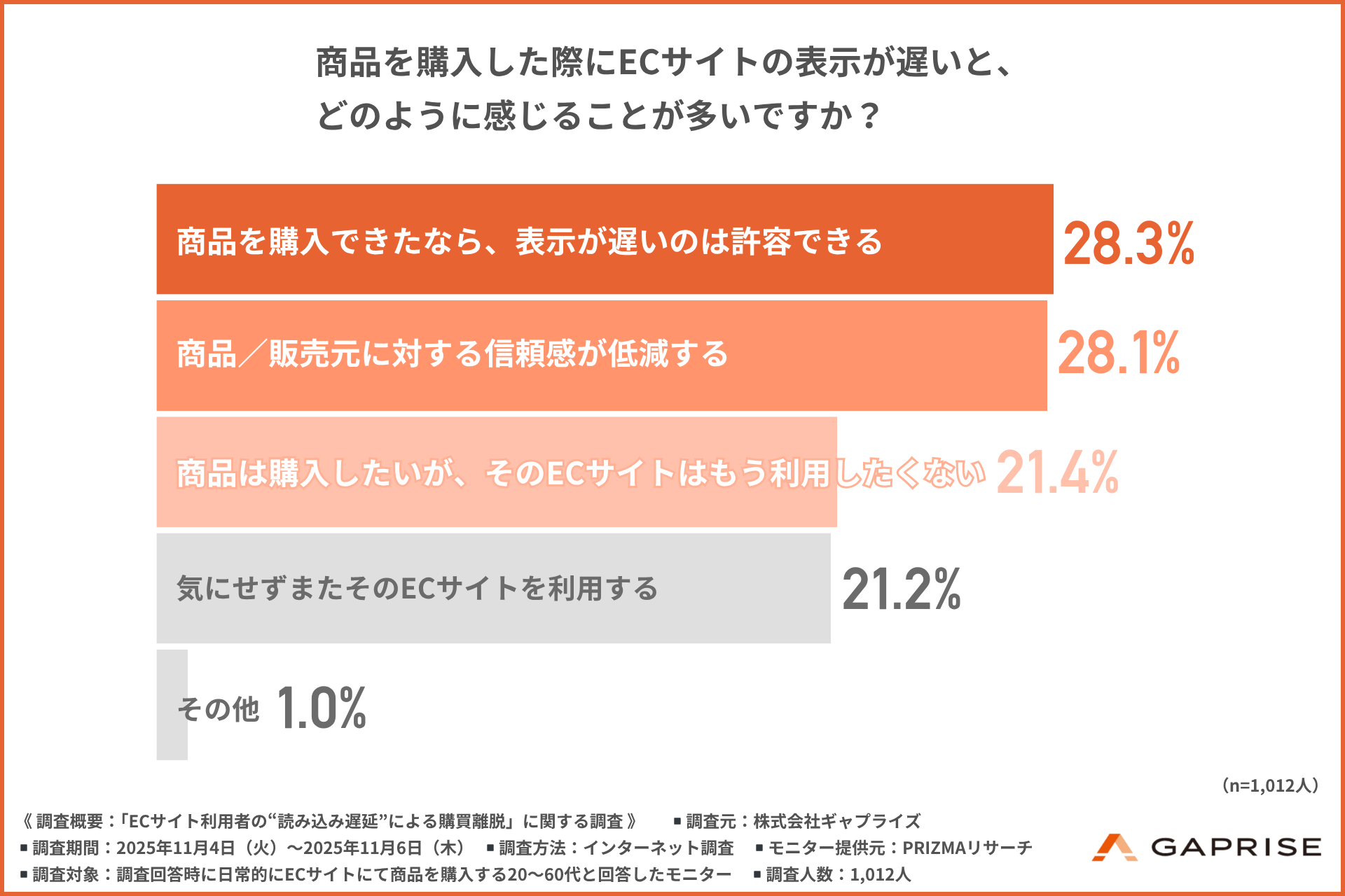 そこで今回、株式会社ギャプライズ(https://www.gaprise.com/)は、日常的にECサイトにて商品を購入する20~60代の方を対象に、「ECサイト利用者の“読み込み遅延”による購買離脱」に関する調査を行いました。