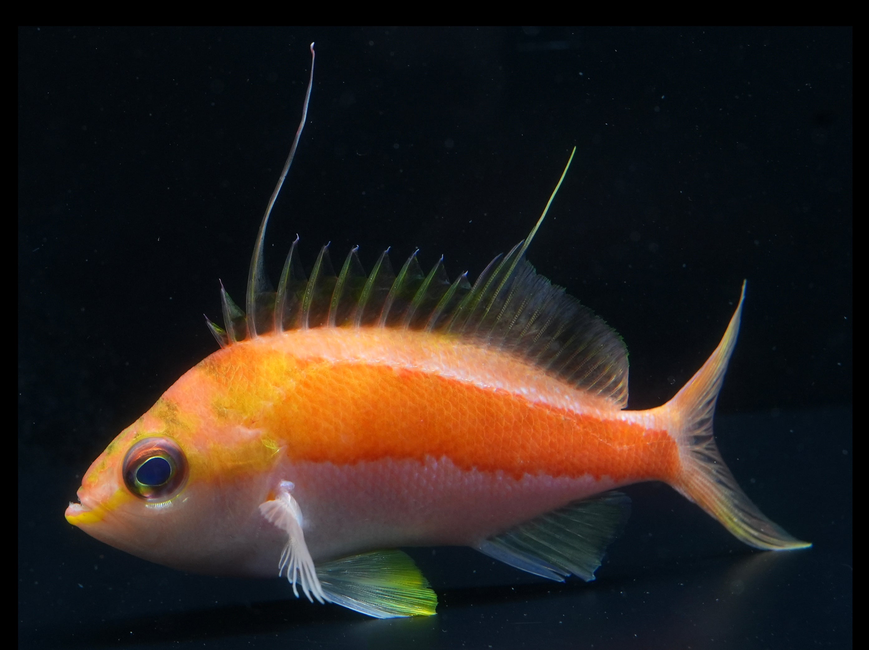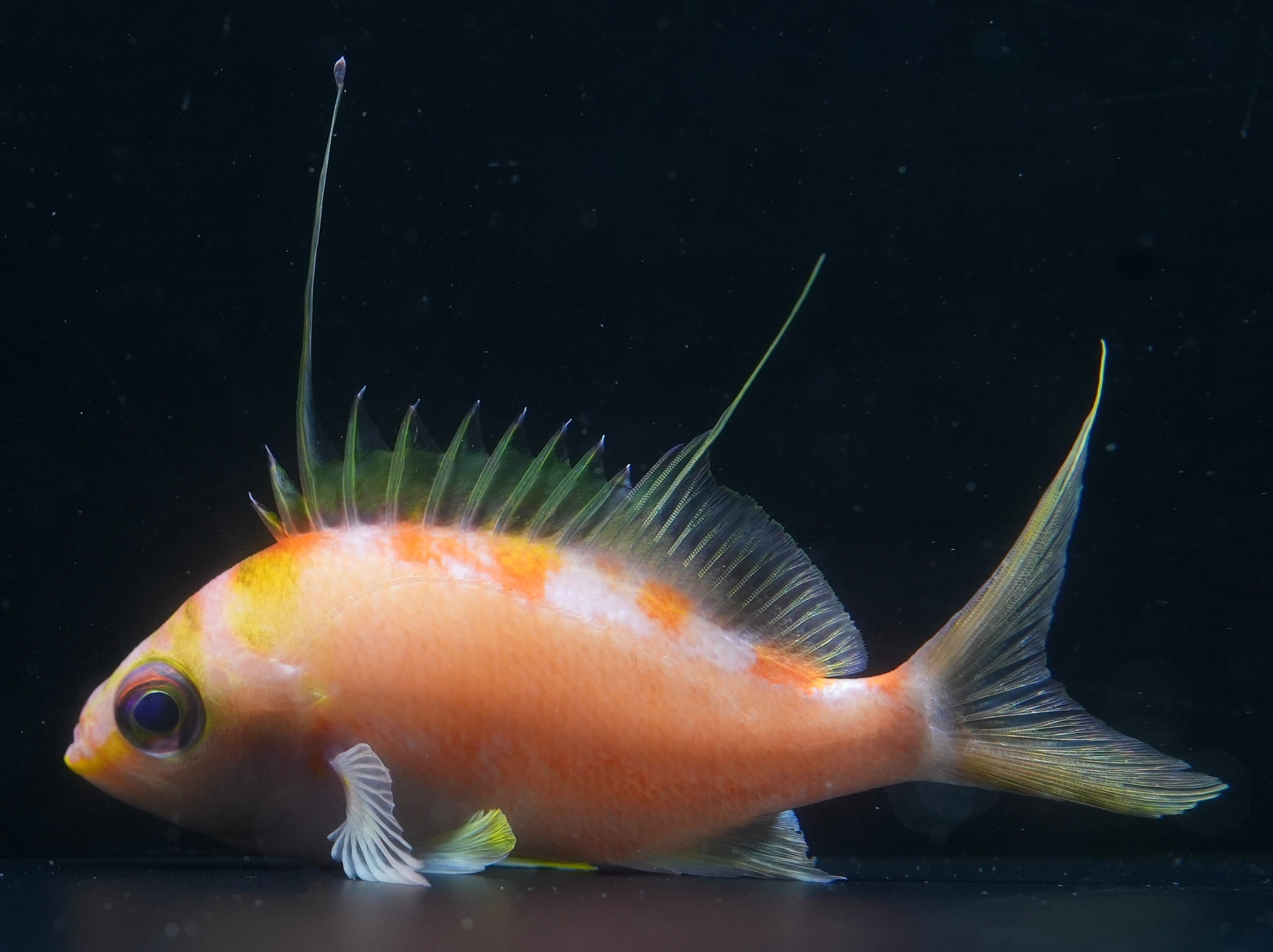 タスキサクラダイの体側を斜めにはしる黄色い帯模様が「襷(たすき)」を思わせることが、和名の由来となっており、飼育下ではその濃淡が変化する様子も観察されています。今回の論文掲載を機に、本種の体色や形態をよりじっくりご覧いただけるよう、生体展示を開始いたしました。