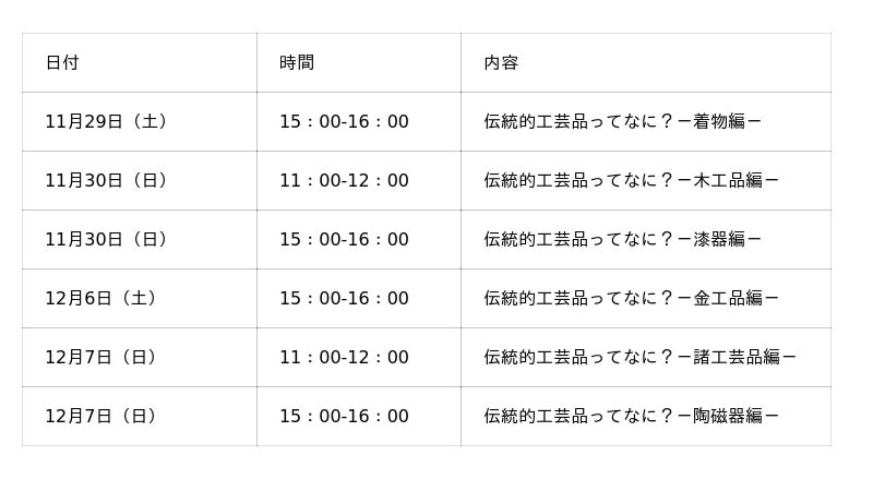 会期中の土・日曜に、伝統工芸士によるギャラリートークを開催します(全6回)。「伝統的工芸品ってなに?」をテーマに、各回で異なる専門分野の伝統工芸士が、産地の歴史・技術と、展示品の鑑賞のポイントを解説します。