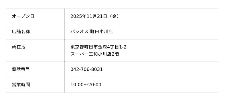 株式会社田原屋(本社所在地:神奈川県川崎市、代表取締役会長:田熊 太郎、代表取締役社長:甲斐 直裕)は、2025年11月21日(金)東京都町田市の「スーパー三和小川店」内に、「パシオス 町田小川店」をオープンいたします。