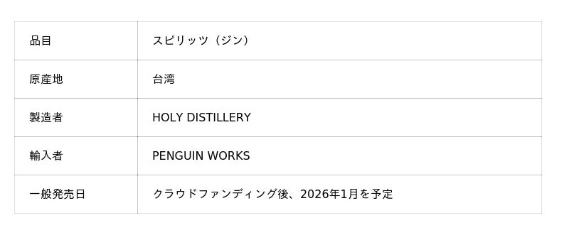 中国語圏からの輸入を手掛けるPENGUIN WORKSは、この度台湾におけるクラフトジンのパイオニアとして国内にて高い人気を誇るHOLY DISTILLERYとの直輸入契約を結び、日本初上陸の台湾クラフトジンの取り扱いを開始いたします。