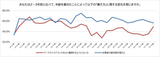 さらに、2つの項目について世代間比較をみたところ、40代から「ワークライフバランスをより重視するようになった」が減少し、40代半ばに「仕事後の疲労感が増えた」がピークになっています。このことから、20代後半から30代にかけては仕事とプライベートの両立を重視し、40代半ばは両立重視の働き方から変化するタイミングであることが伺えます。