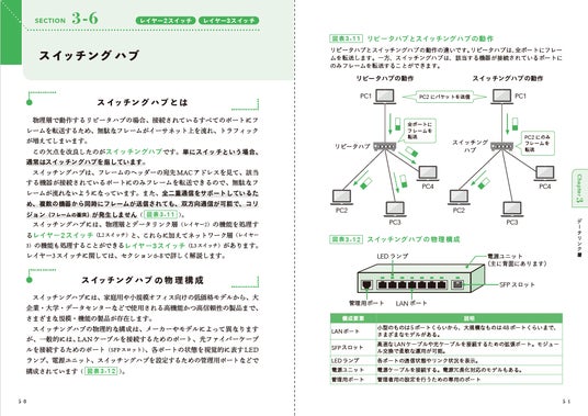 スイッチングハブやLANケーブル、光ファイバーなど、実際の機材の仕組みや信号の流れも図で丁寧に解説しているため、目に見えにくいネットワークの動きを「実感」として理解できます。複雑に見える通信の流れについても、OSI参照モデルの各層ごとに章を分けて丁寧に解説しているため、初学者に理解しやすい「全体像から順に理解できる」やさしい構成となっていることも特長です。