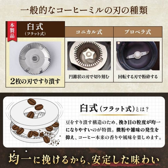 本製品は、均一な粒度で香り高いコーヒーが楽しめる、臼式(フラット式)カッター採用のコンパクト電動ミルです。