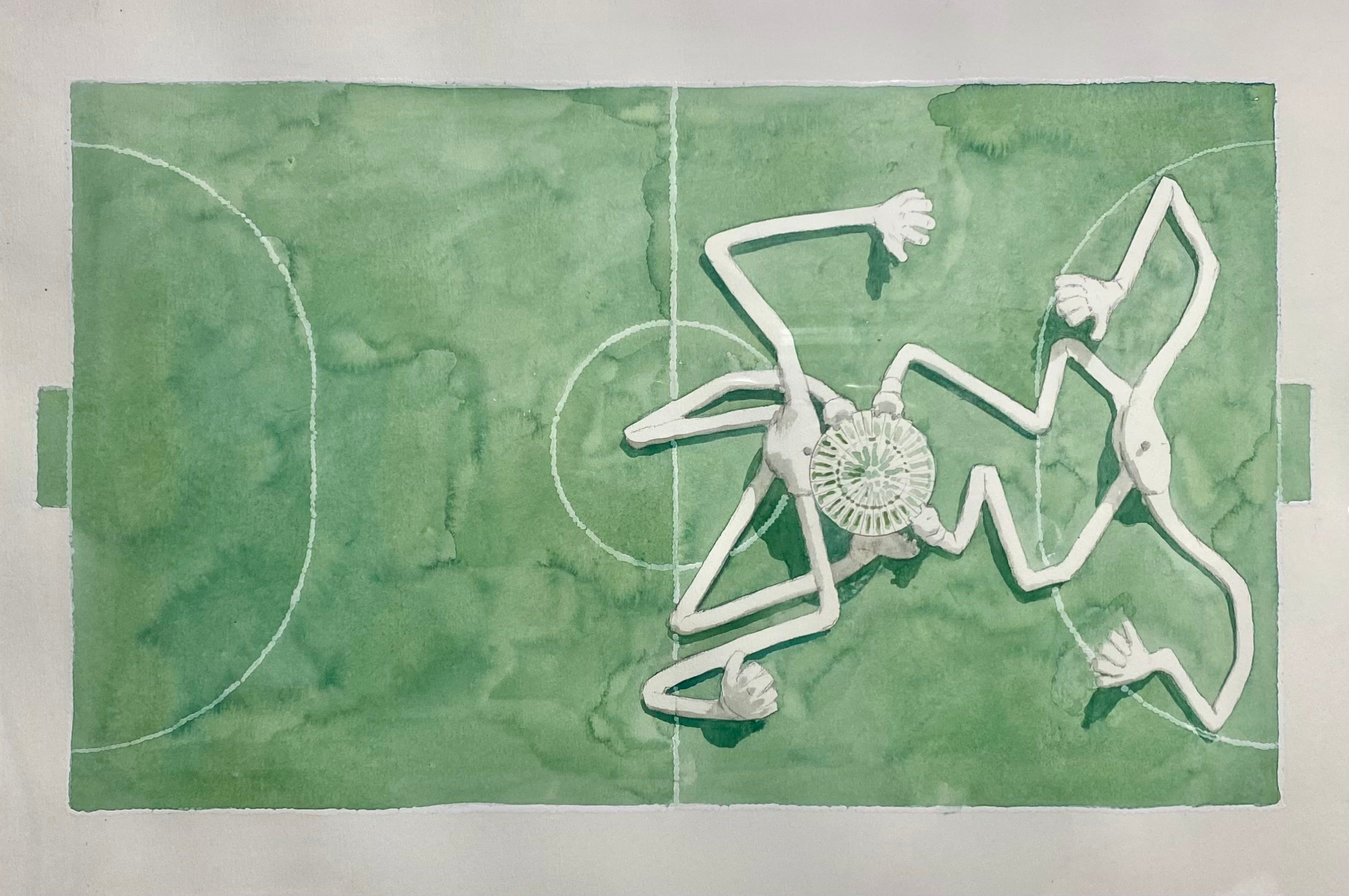 初見ではそのビジュアルインパクトとユーモアに目を奪われますが、観戦を続けるうちに、シンプルながら精巧なパフォーマンスから多様な視点が立ち上がってきます。時空スケールの大きなズレにより、見慣れたはずのサッカーが大自然の現象のように変容していく静謐さ、脳からの電気信号や筋肉のつながりが個々の身体や意思を超えて拡張されていく様子が感じられます。そして個人間のネットワークの中で主体が流動し変化していく過程を可視化し、物理世界の普遍性と人間の生々しさを鋭く照らし出します。