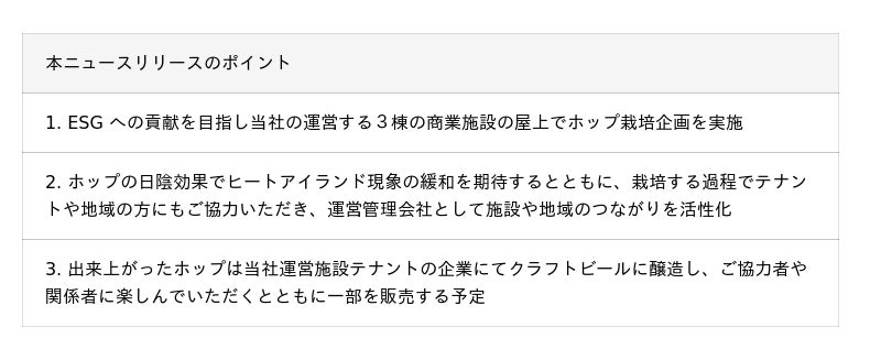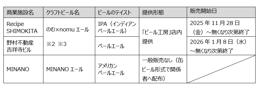 なお、これら醸造にあたっては、当社のテナント企業である「ビール工房」(新宿野村ビル地下1 階)へホップを提供し、醸造販売いただくことでテナントの売上貢献にも寄与しています。