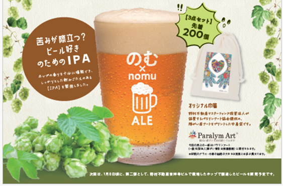 ※3:各発売日から先着200 名は「のむ×nomu ALE」ビール+オリジナルグラス+パラリンアート巾着の3 点セット販売となります。