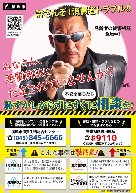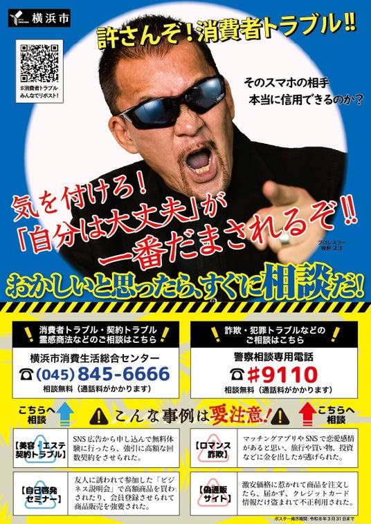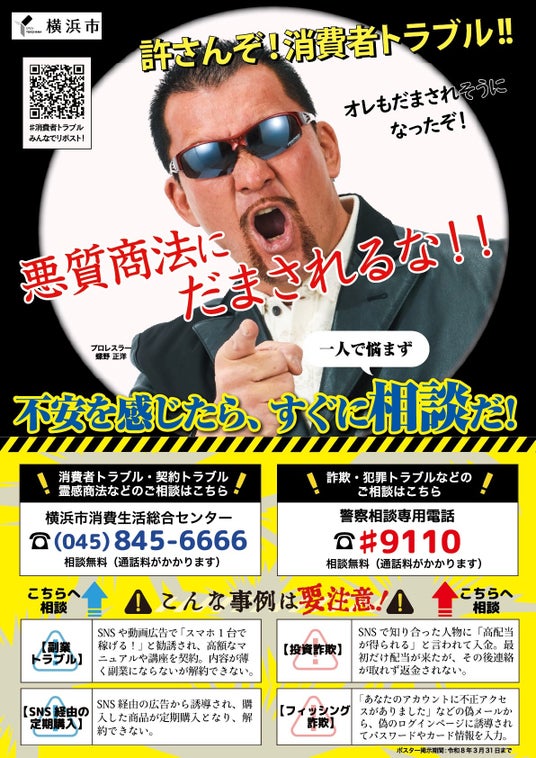 横浜市は、近年増加傾向にある「悪質商法」や「特殊詐欺」の未然防止を目的に、神奈川県警察と連携し、プロレスラーの「蝶野正洋」氏を起用した「許さんぞ!消費者トラブル!!」ポスターを制作しました。