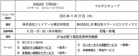 〇「BAGGAGE STORAGE+」は仙台駅3階エリアへの移転にあわせ、当日ホテル配送サービスと手荷物一時預かりサービスを拡充します。