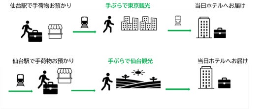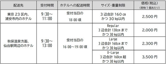 東京23区および浦安市内のホテルに加え、新たに仙台市内の一部エリア(秋保温泉方面・仙台駅周辺ホテル)が配送エリア対象になります。これにより、仙台駅から東京方面へ向かわれるお客さまだけでなく、仙台駅にいらしたお客さまにもより快適にご利用いただけるようになります。