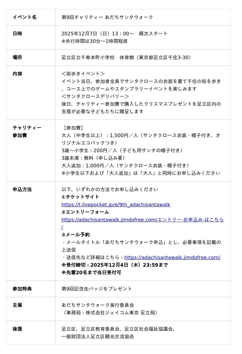 株式会社ジェイコム東京 足立局(J:COM 足立、所在地:東京都足立区、局長:前田泰洋)は、あだちサンタウォーク実行委員会の事務局として、足立区内の子どもたちを支援するチャリティーイベント「あだちサンタウォーク」を2025年12月7日(日)に開催・運営します。